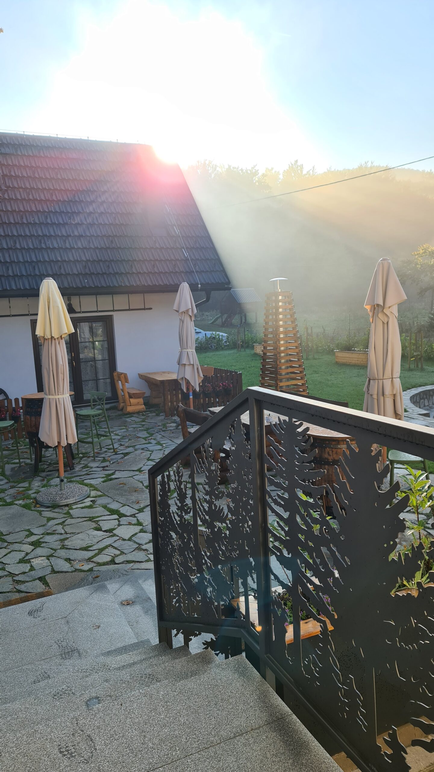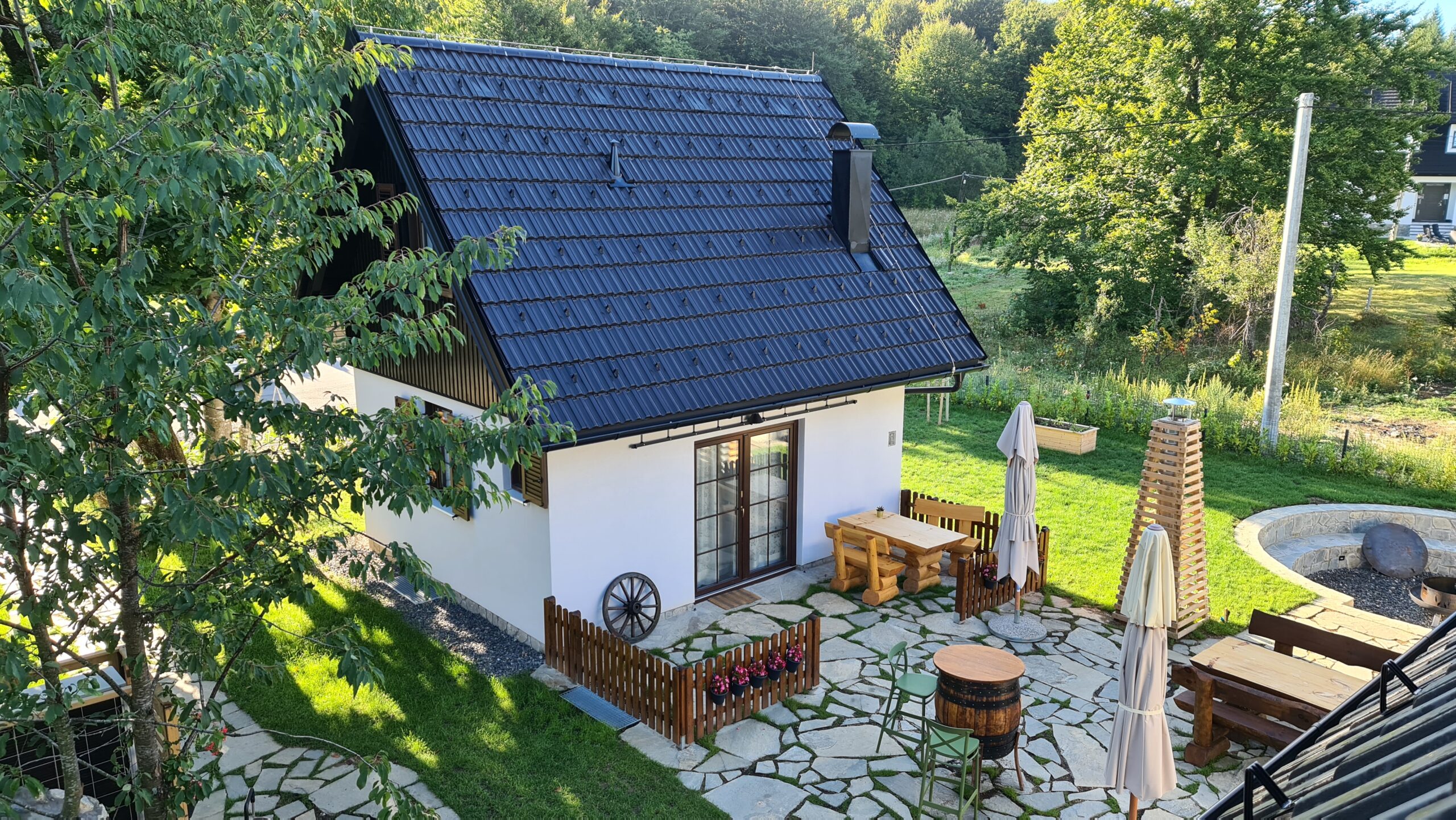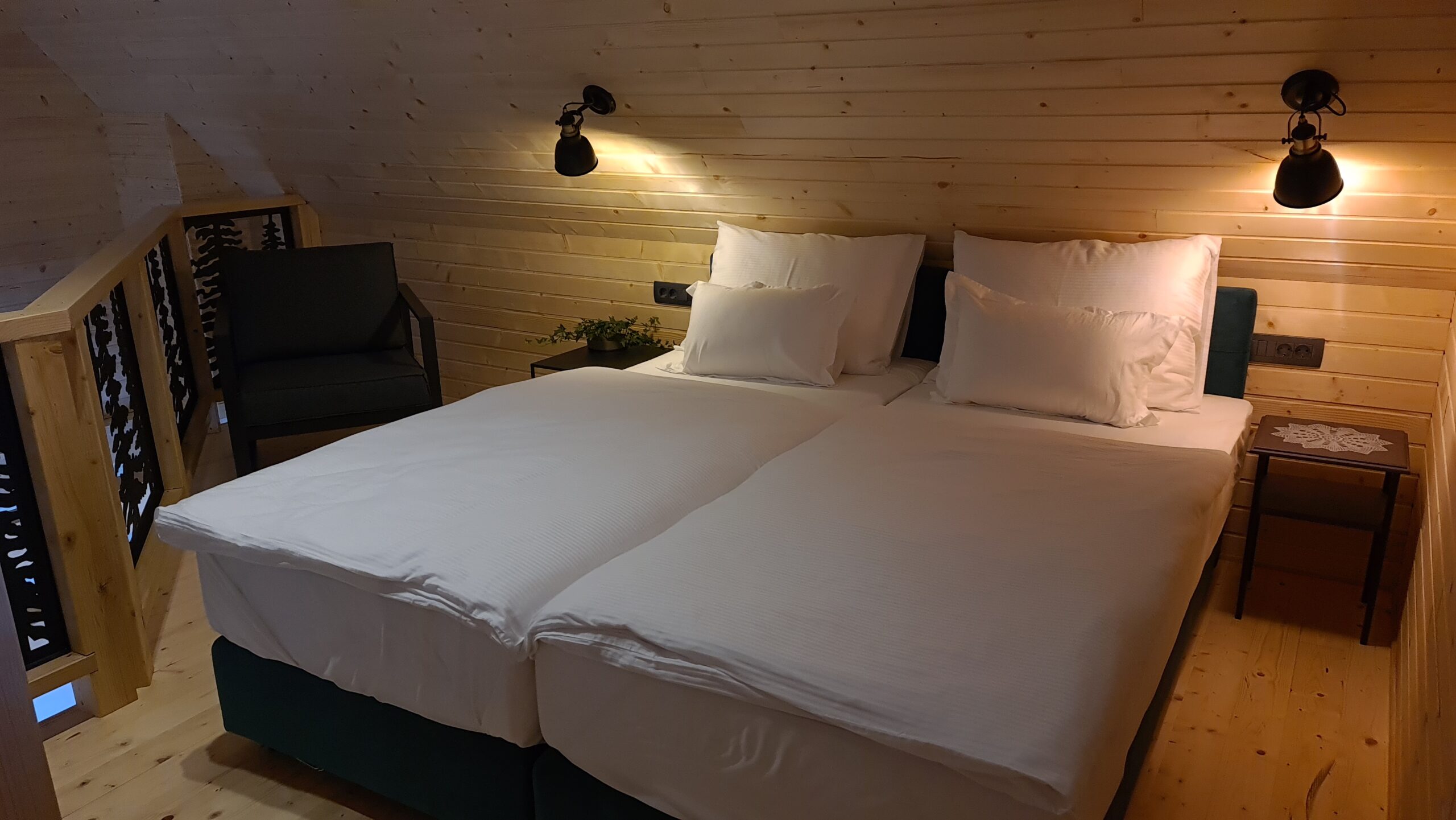 For those seeking more privacy there is a cabin in the yard. With its size of 38m2, built in two in two levels, it can accommodate five persons maximum. On the ground floor there is a large living room with a comfortable corner sofa folding into a big cot for two persons, a bathroom and an armchair folding into a single cot. In the first floor there is a king-size Bernarda Royal double bed with Bernarda Superlux mattresses catering for good rest.