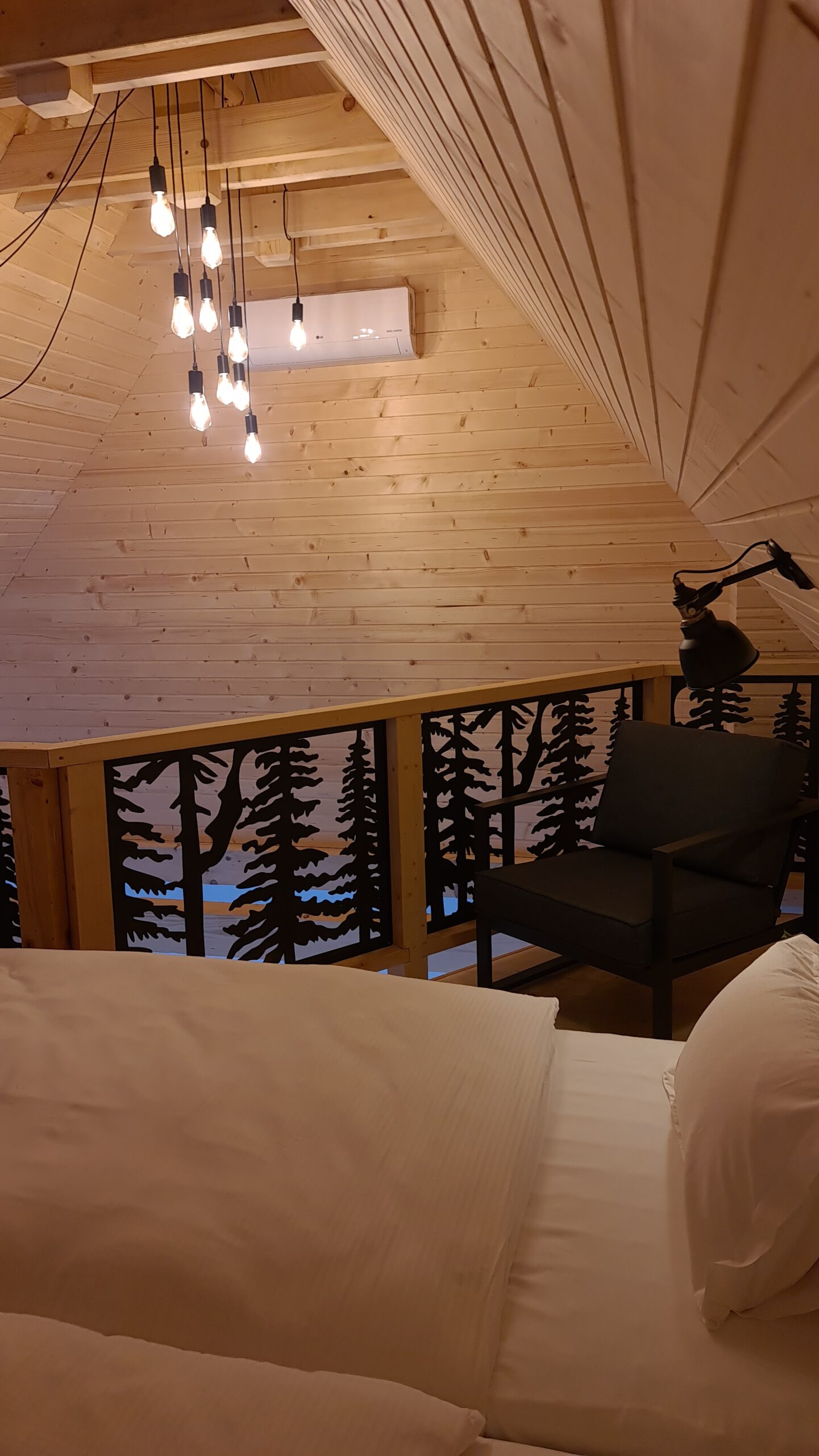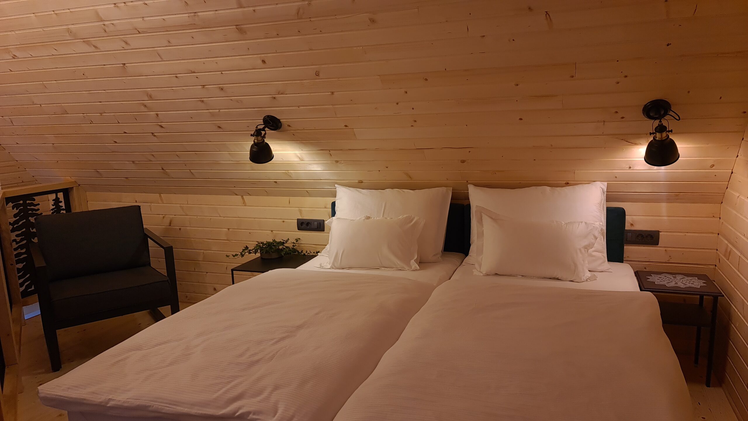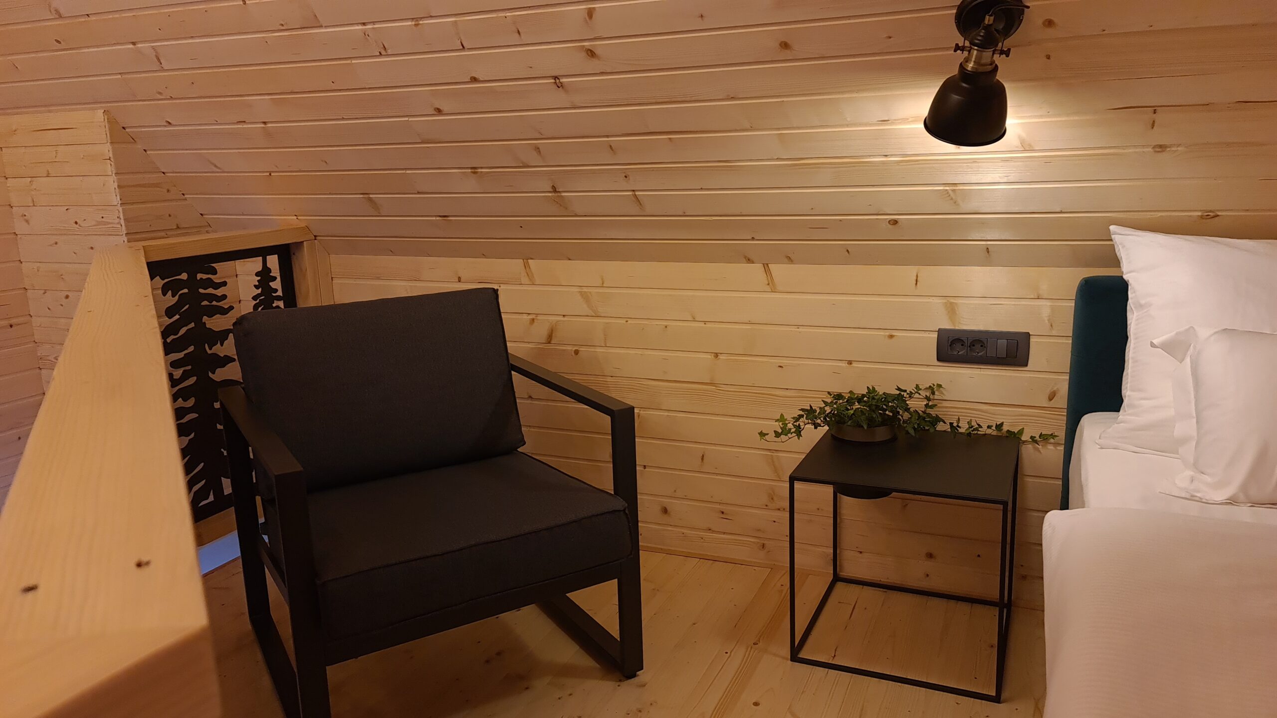 The cabin is made in rustic design with lots of wood and natural materials, there is an electric fireplace and a terrace. With thorough selection of details we have managed to create warm atmosphere of „being at home far away from home“.
