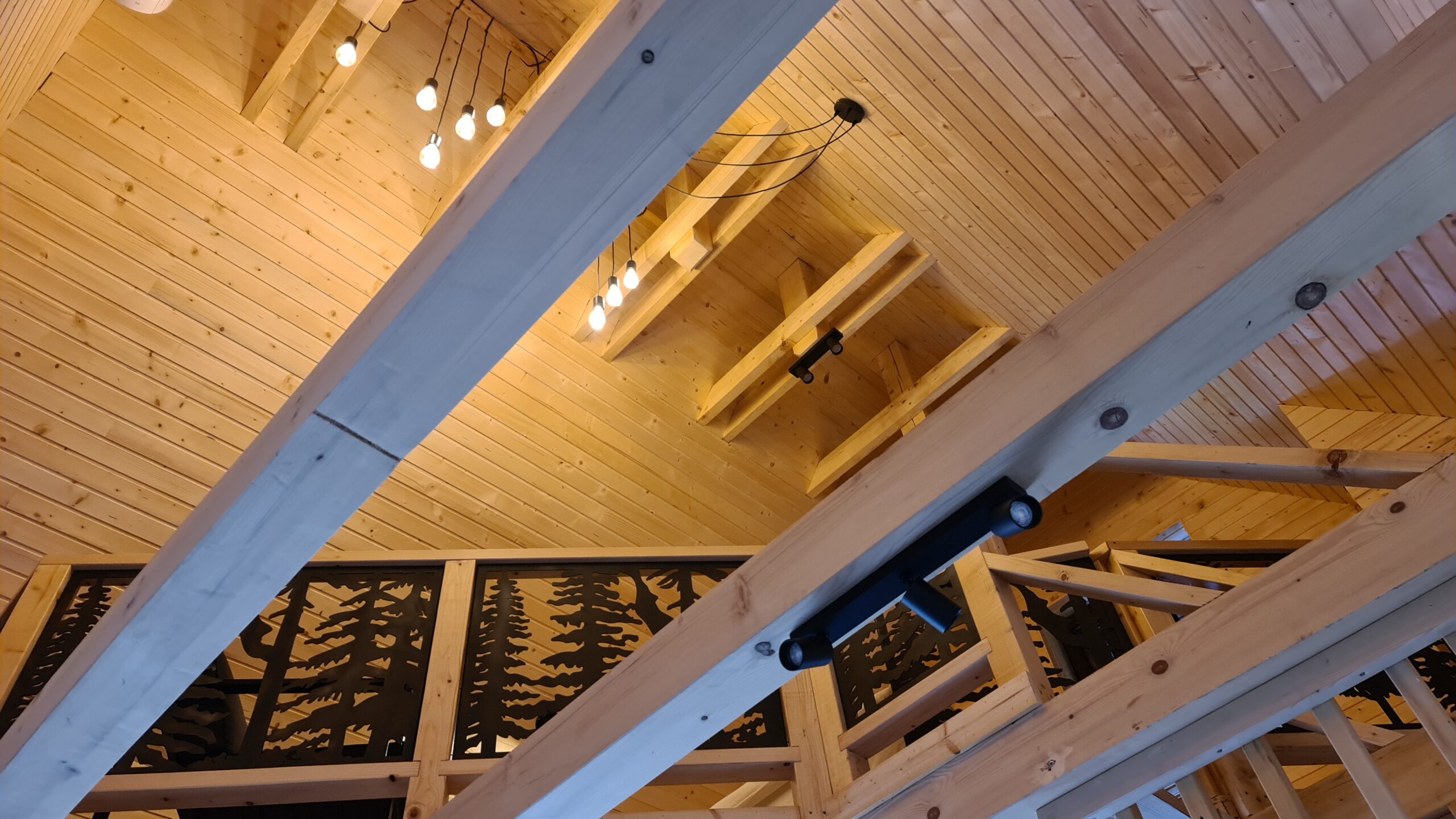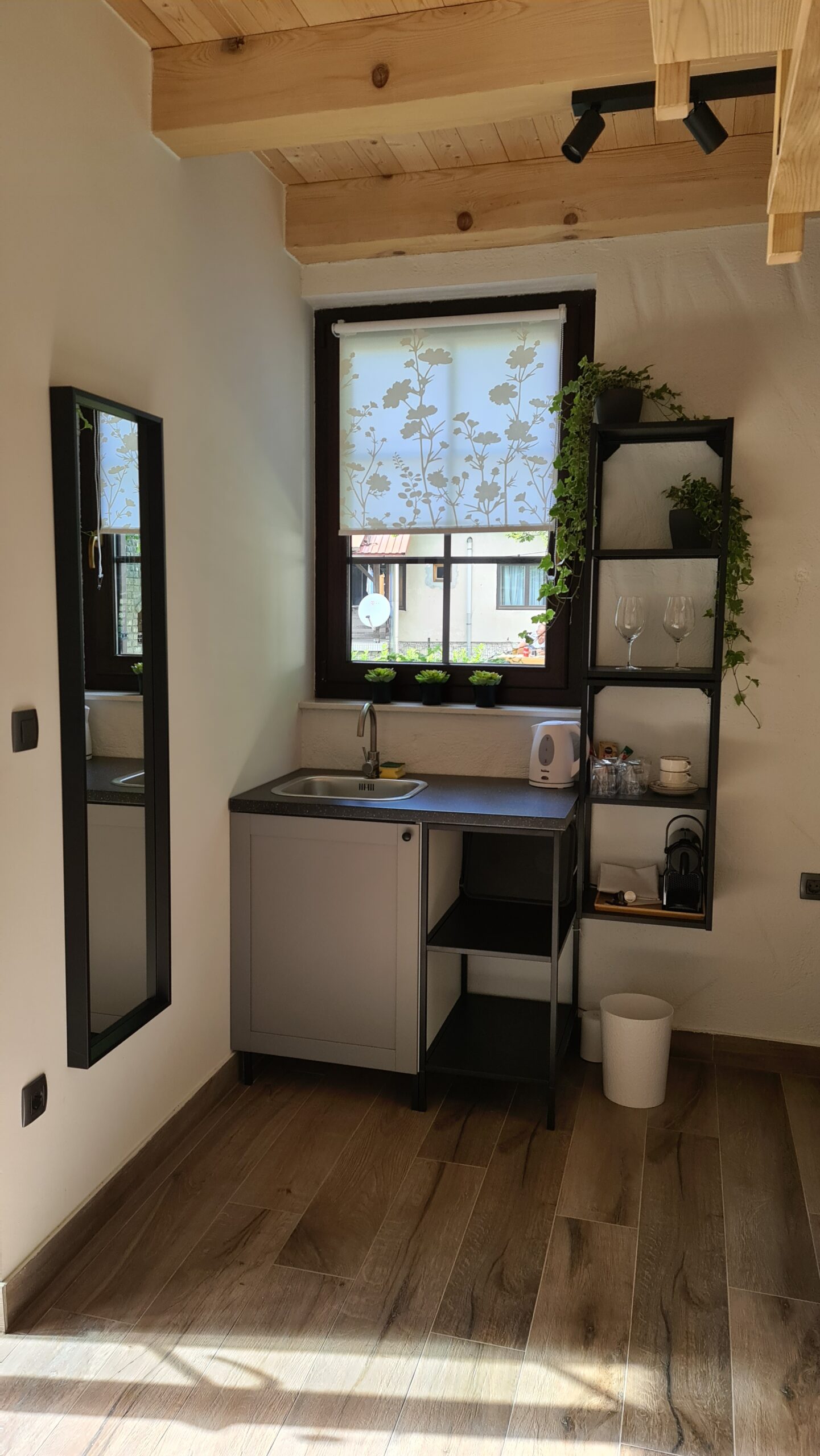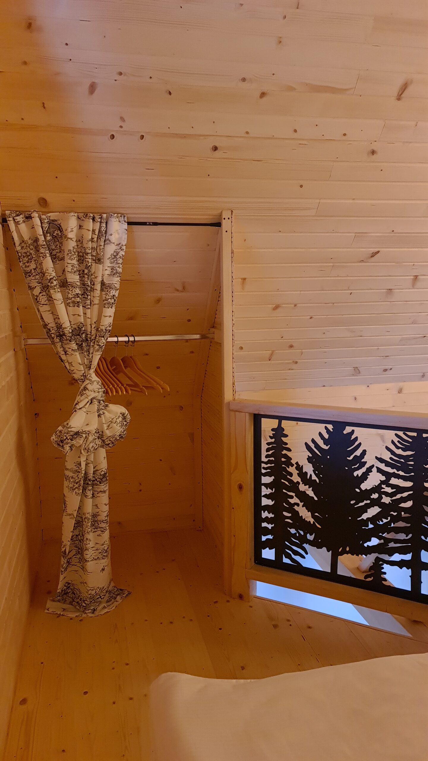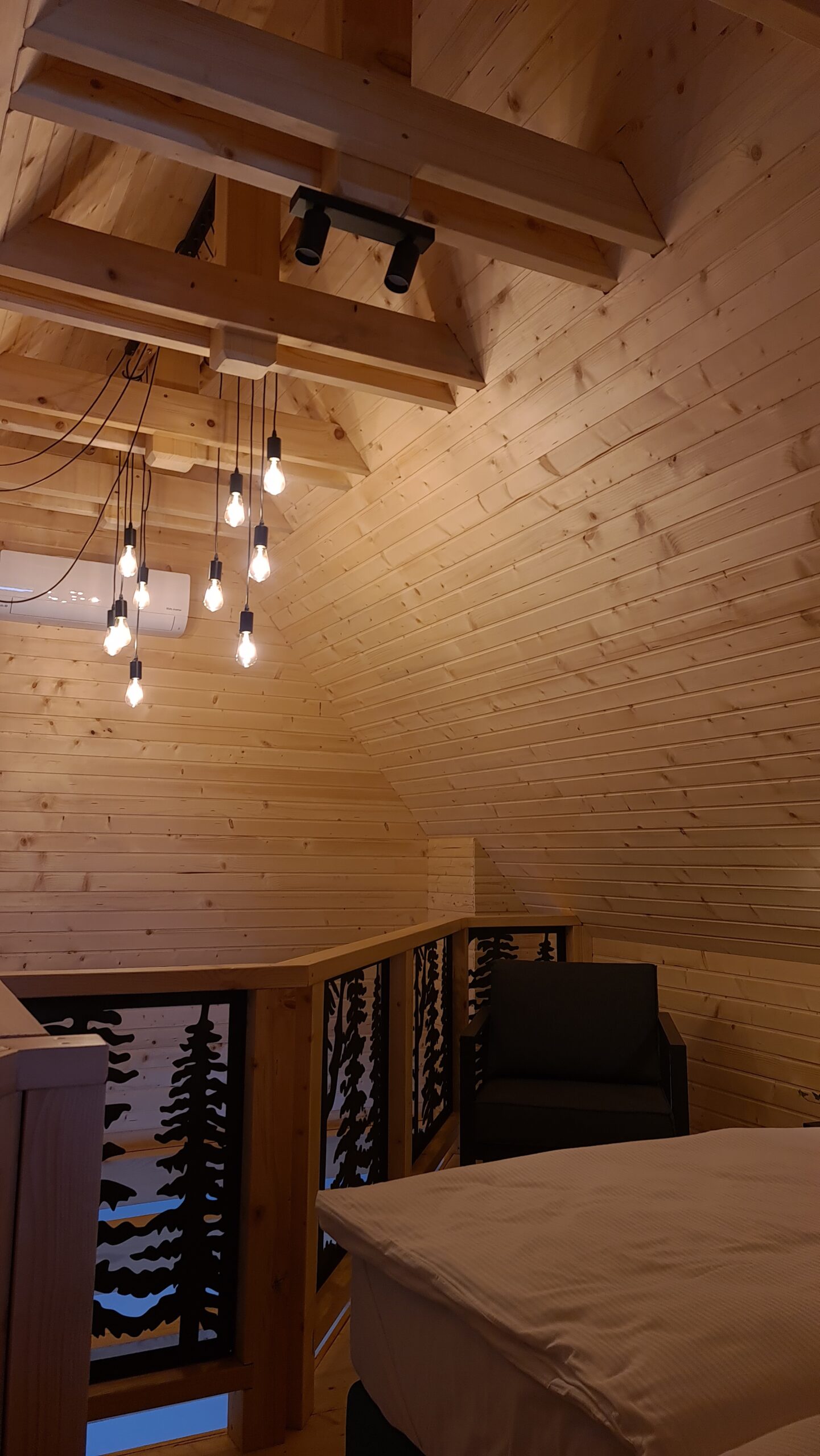 The cabin is made in rustic design with lots of wood and natural materials, there is an electric fireplace and a terrace. With thorough selection of details we have managed to create warm atmosphere of „being at home far away from home“.